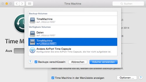 An dieser Stelle kommt wieder der Sicherheitsfanatiker in mir hervor: Auch meine Time Machine Backups werden verschlüsselt abgelegt. Hierfür habe ich bei der Auswahl des Volumes für Time Machine einfach den Haken „Backup verschlüsseln“ gesetzt.