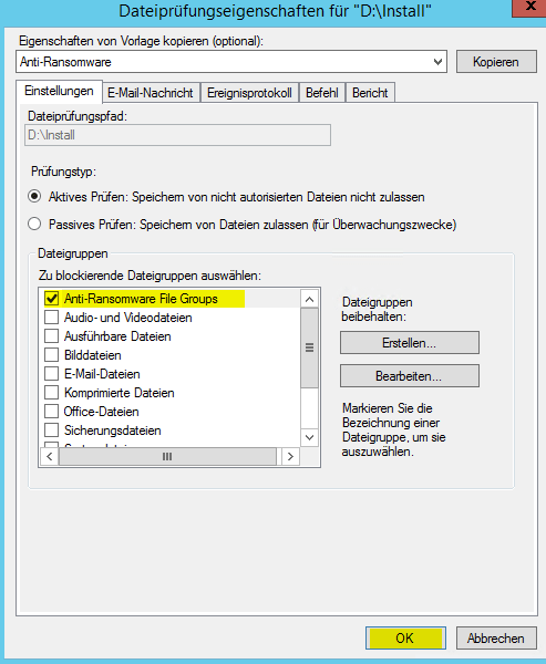 Anlegen der Dateigruppe „Anti-Ransomware File Groups“